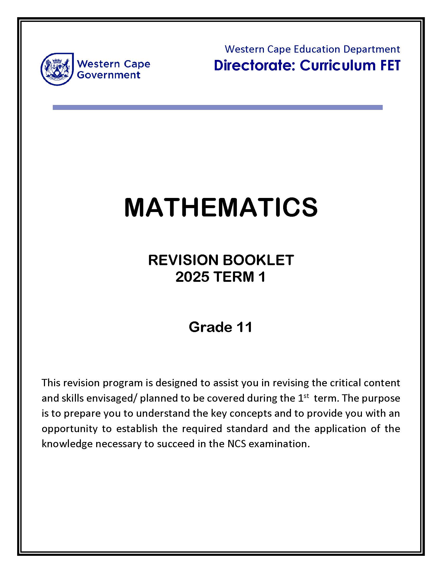 This is revision material for grade 11 learners on the work covered in term 1. The content covered in this revision material is, exponents and surds, equations, nature of roots and inequalities, geometry and trigonometry.