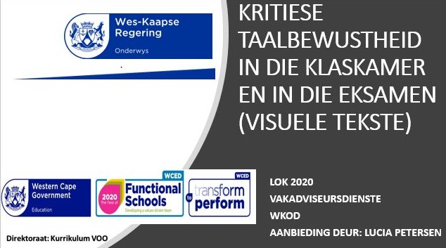 ’n PowerPoint-aanbieding oor Kritiese Taalbewustheid wat Lucia Petersen, Afrikaansvakadviseur in Metropool-Suid, by die 2020 LOK-simposium vir Afrikaansonderwysers gelewer het. Hierdie aanbieding kan deur Graad 10, 11 en 12 Afrikaans Huistaal sowel as Eerste Addisionele Taalonderwysers gebruik word.